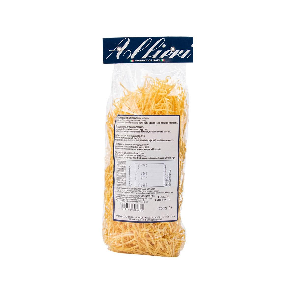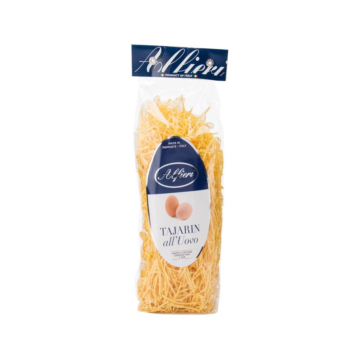 The highest quality egg pasta, a thin puff pastry that takes a few minutes of cooking and that keeps all its organoleptic properties completely unchanged. Made in Piedmont, Italy, this Tajarin Egg Pasta is suitable for a simple butter and sage sauce, or a sauce made with veal and pork sausage, both are scrumptious.