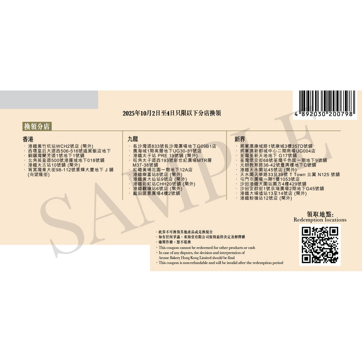- This coupon shall be applicable to the selected physical goods. Please refer to (https://www.aromebakery.com.hk/mc/redemption/) for redemption details of physical goods.