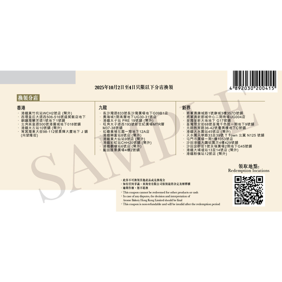 - Redemption period: 20 August 2025 to 1 October 2025 (Arome branches of HKSAR) / 2 October 2025 to 4 October 2025 (Designated Arome branches of HKSAR).