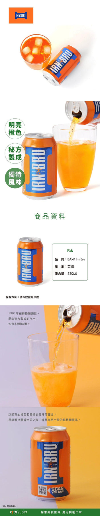 Launched in 1901 in Scotland, IRN-BRU is a carbonated soft drink made to an original secret recipe, which contains 32 flavours, known for its bright orange colour and unique flavour, often described as "Scotland's other national drink" after Scotch whisky.