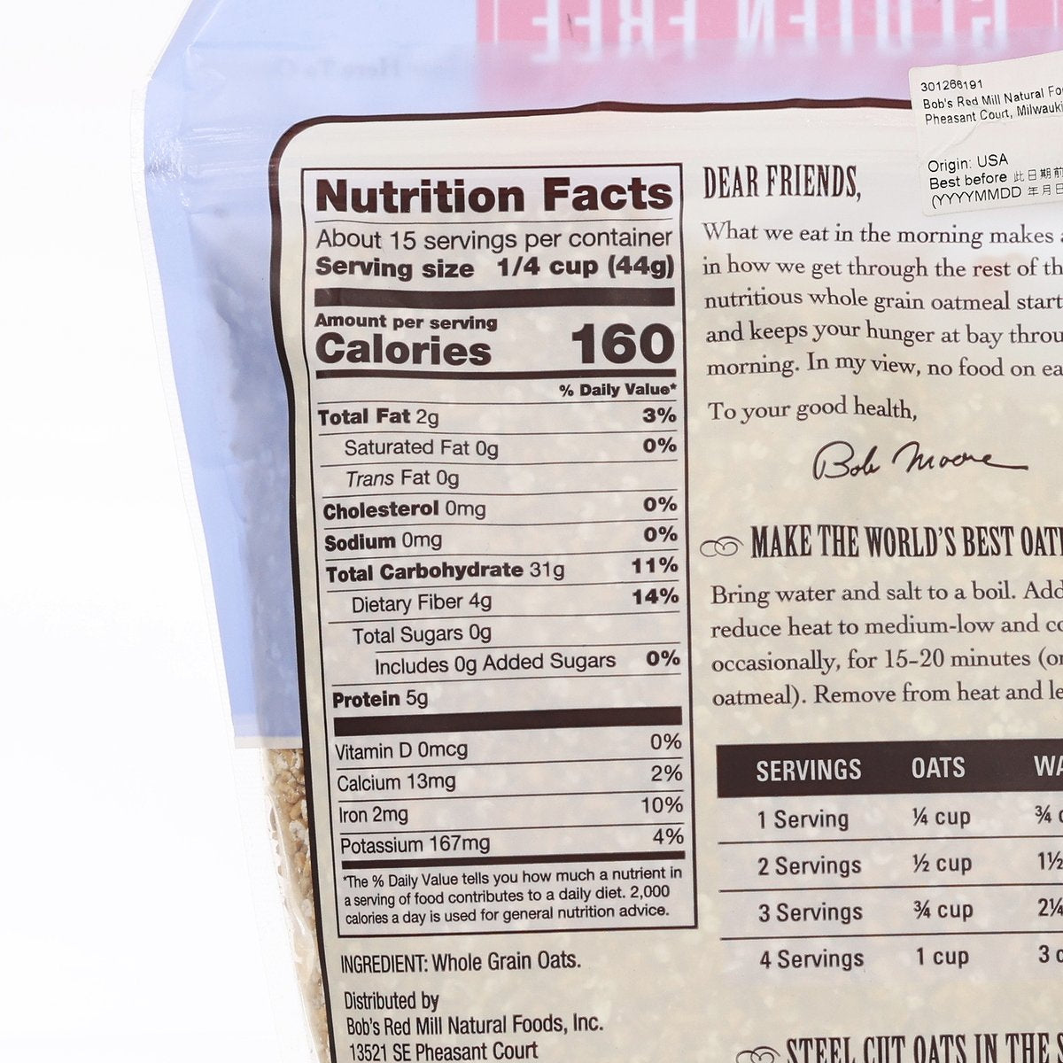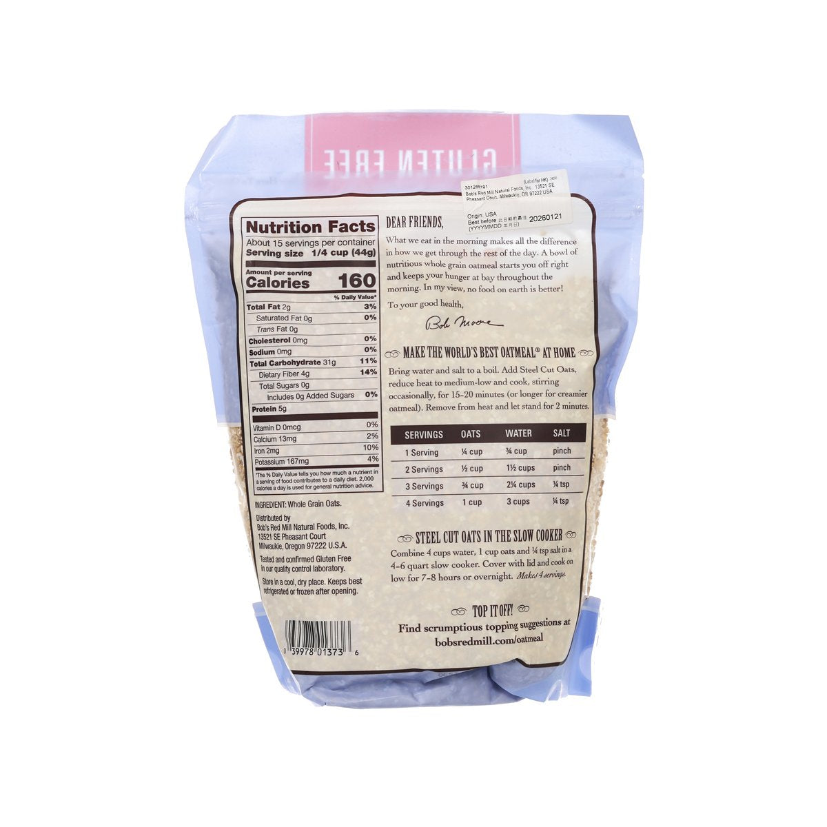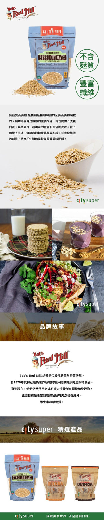 BOB'S RED MILL Gluten Free Steel Cut Oats is made from kiln toasted, whole grain oat groats that have been cut into neat little pieces on a steel burr mill. It is perfect to make a delightfully full-bodied hot cereal that is sure to satisfy, free feel to top with your favourite additions such as maple syrup, brown sugar, or go with savoury toppings like peanut butter, it is also ideal for overnight oats!
