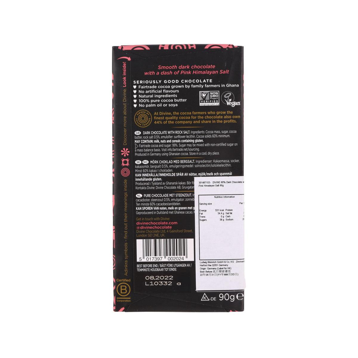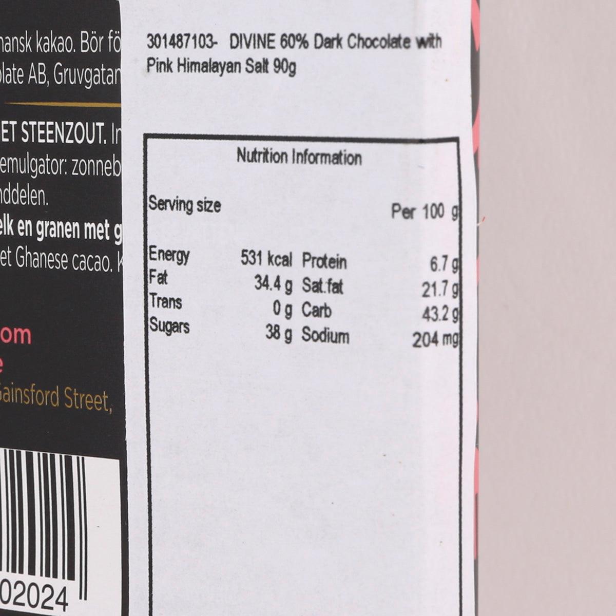 DIVINE 60% Dark Chocolate with Pink Himalayan Salt (90g)
