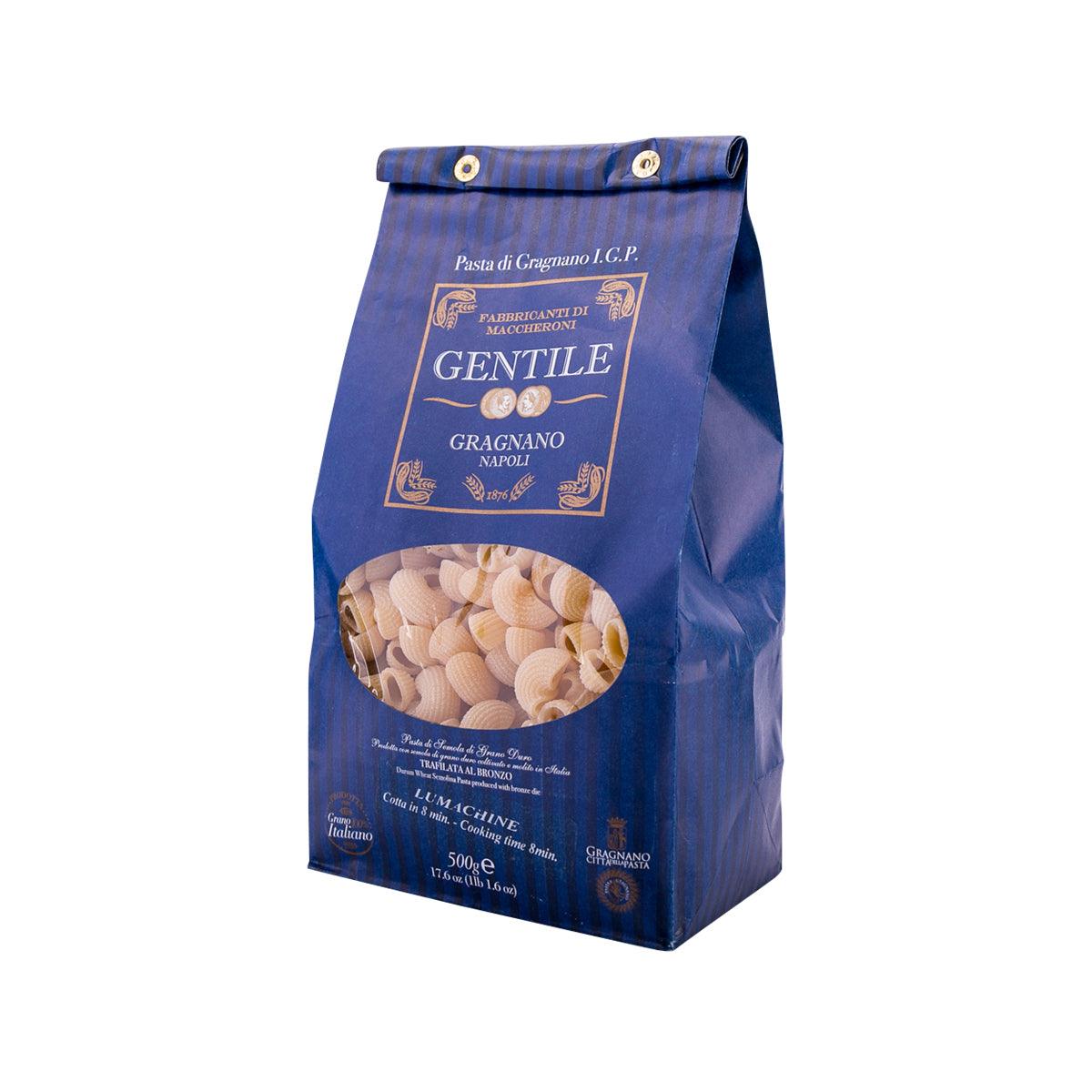 Made from 100% Italian wheat, and cut from bronze dyes, the GENTILE Pasta retains the look, feel and taste of the most esteemed pastas. The roughness of the pasta surface, created by the bronze dyes allows the perfect max amount of sauce cling. Lumachine is shaped like a snail shell, generally served with a heavier chunky sauce.