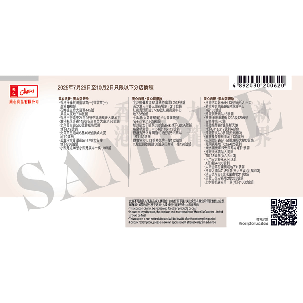 Redemption Location: Redeem at designated Maxim's branches of HKSAR, please refer to the overleaf of the Coupons for details.