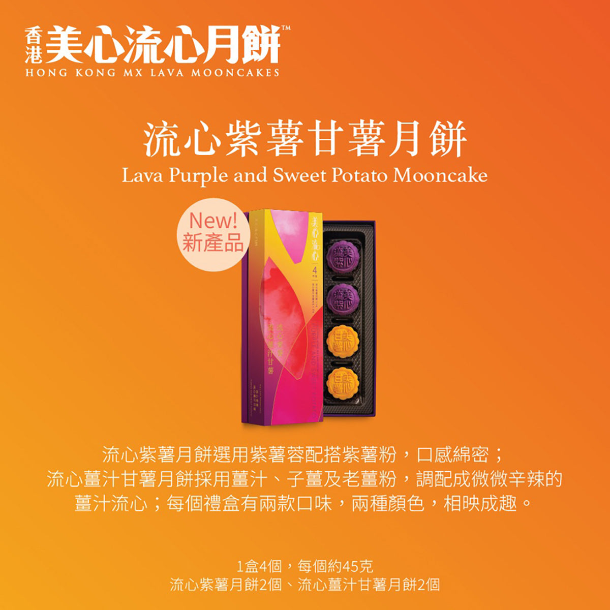 - The gift box features two brand-new flavors: Lava Purple Sweet Potato Mooncake and Lava Ginger Sweet Potato Mooncake. Presented in vibrant purple and yellow hues, the contrasting colours create a visually striking and delightful pairing – perfect as a seasonal autumn treat.