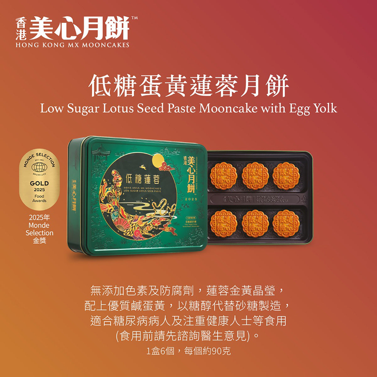 • Substituting sugar with sugar alcohols for health-conscious consumers, this mooncake with salted egg yolk and lotus paste brings the same rich indulgence as the classic treat.