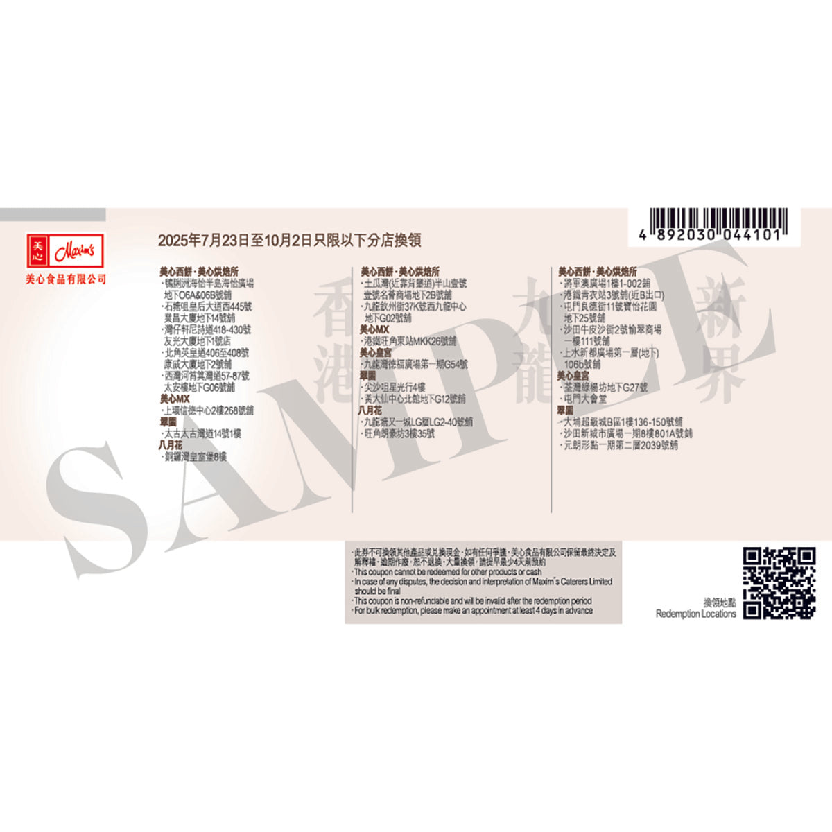 Redemption Location: Redeem at designated Maxim's branches of HKSAR, please refer to the overleaf of the Coupons for details.