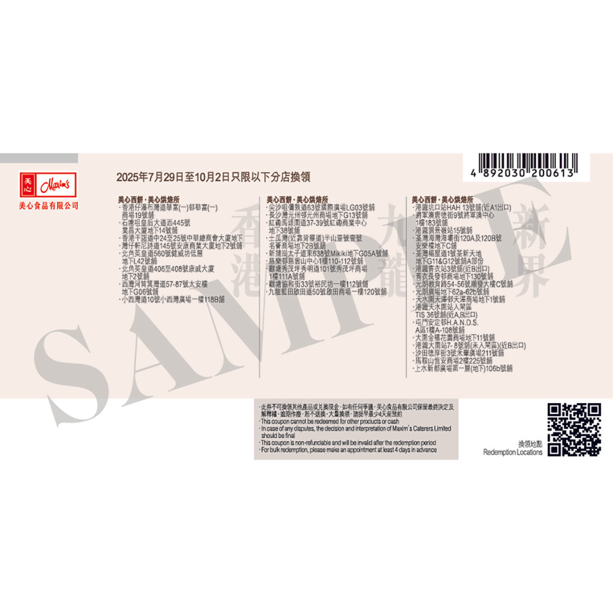 Redemption Location: Redeem at designated Maxim's branches of HKSAR, please refer to the overleaf of the Coupons for details.