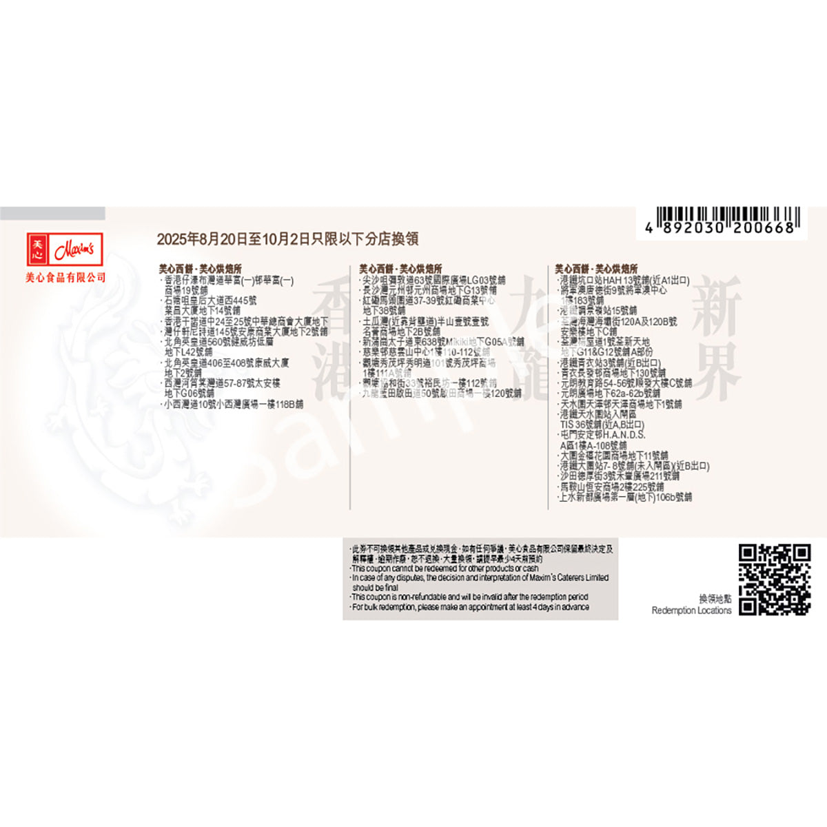 Redemption Location: Redeem at designated Maxim's branches of HKSAR, please refer to the overleaf of the Coupons for details.