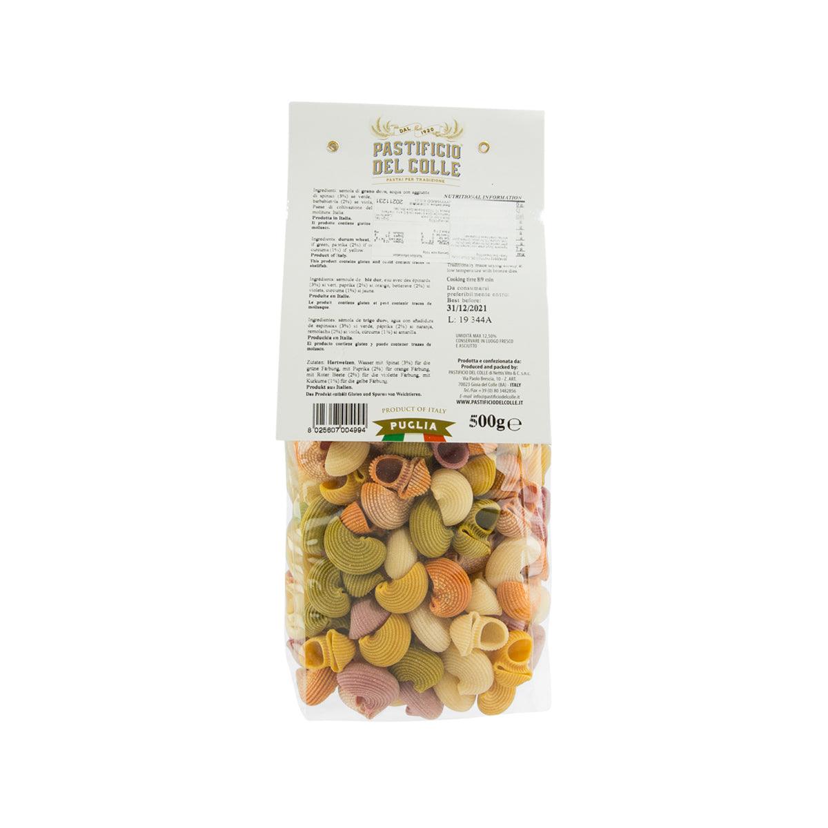 Based in sunny Puglia, the brand has been making pasta for 100 years, well-known for its beautiful coloured pasta shapes, which are all made using natural dyes, such as spinach for green, beet for purple. This colourful snail-shaped pasta is a shape of pasta similar to Macaroni, made of highest quality durum wheat semolina, best served with both thin and chunky sauces.