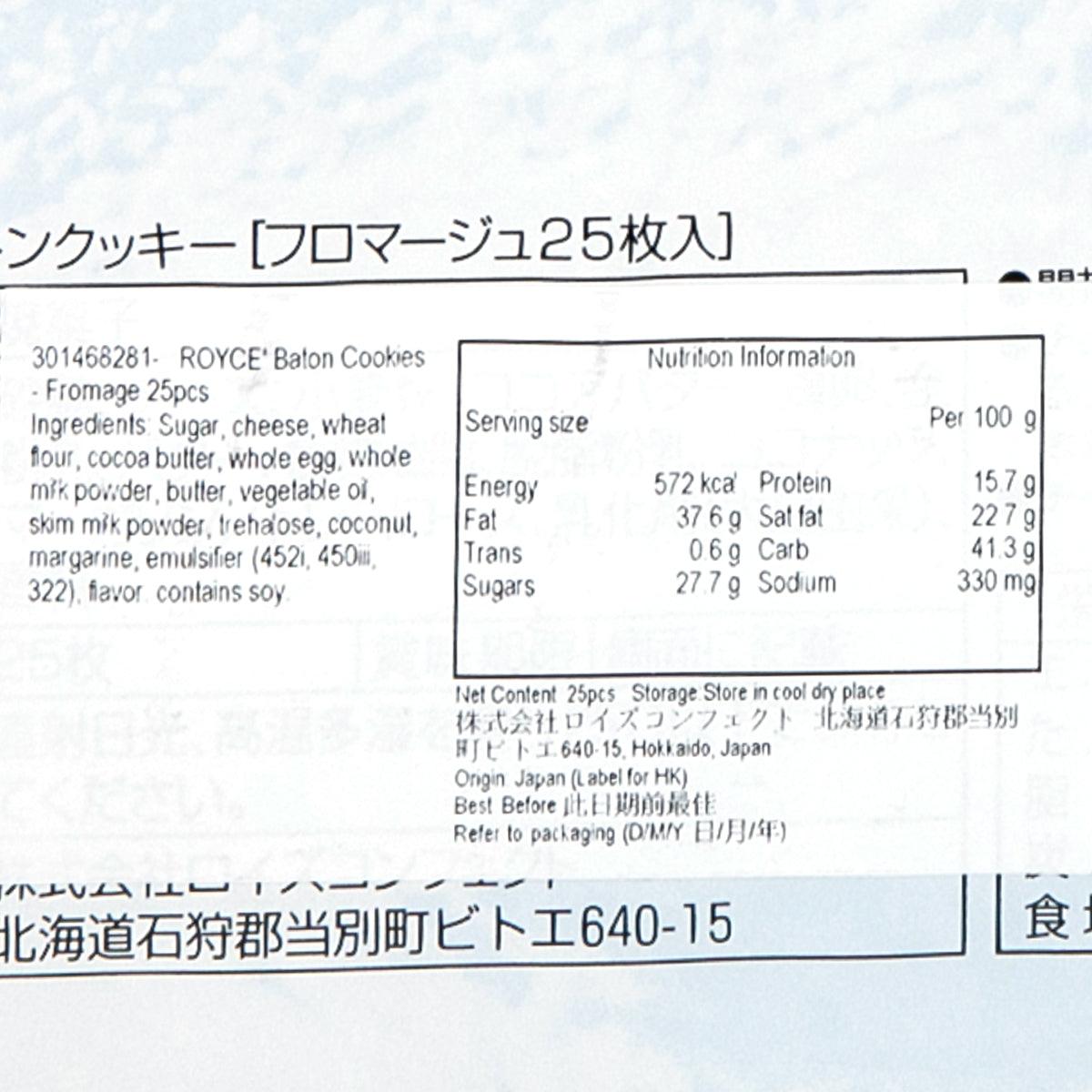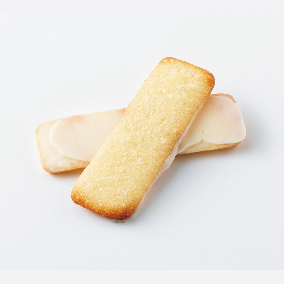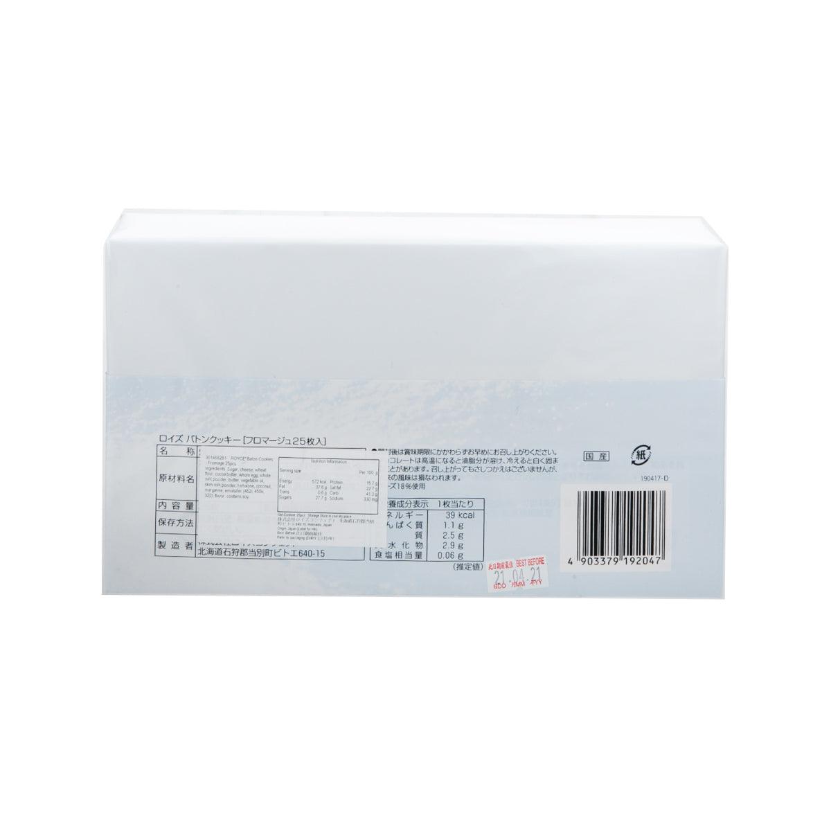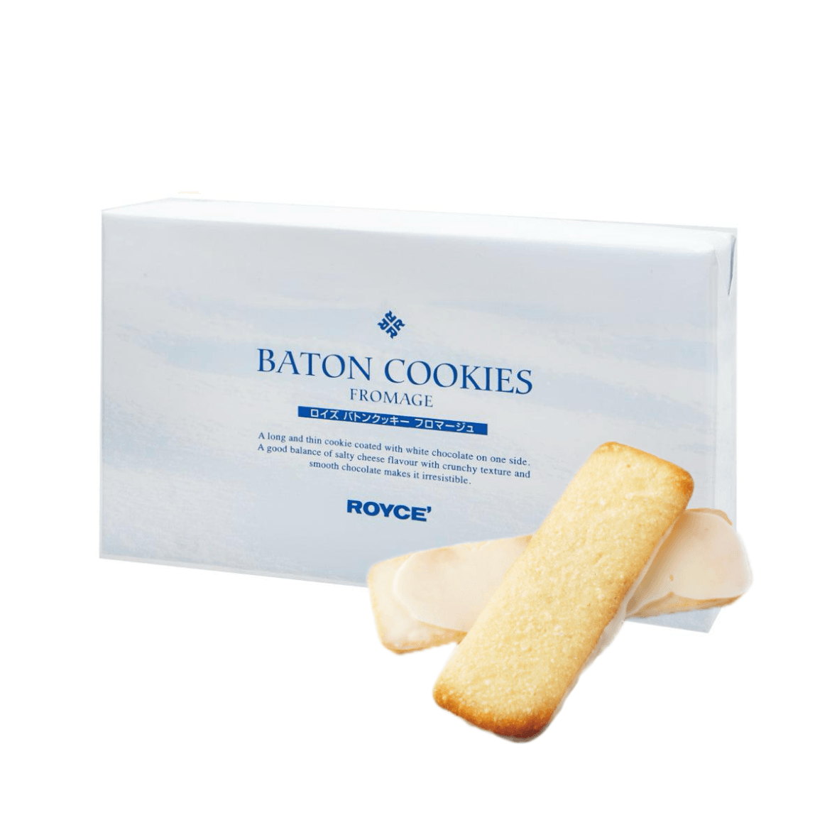ROYCE' was founded in Sapporo in 1983. These are the baton-shaped coconut cookies made with a cookie dough mixed with Parmesan and Gouda cheeses. Each cookie is coated with white chocolate on one side. So tasty! Enjoy!