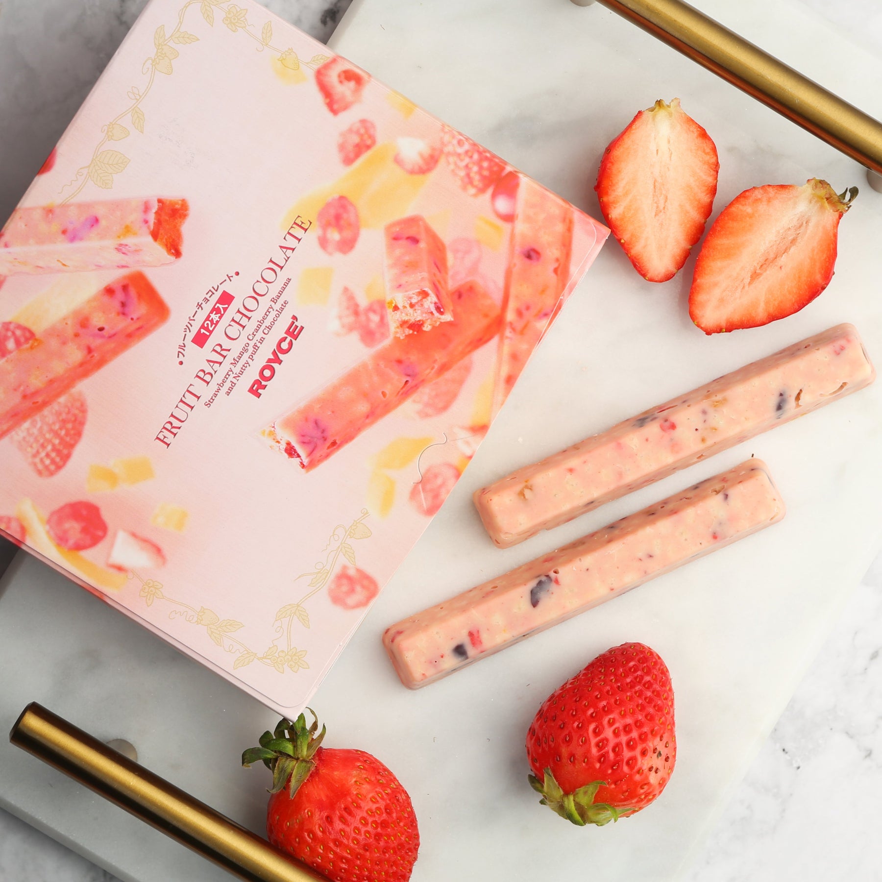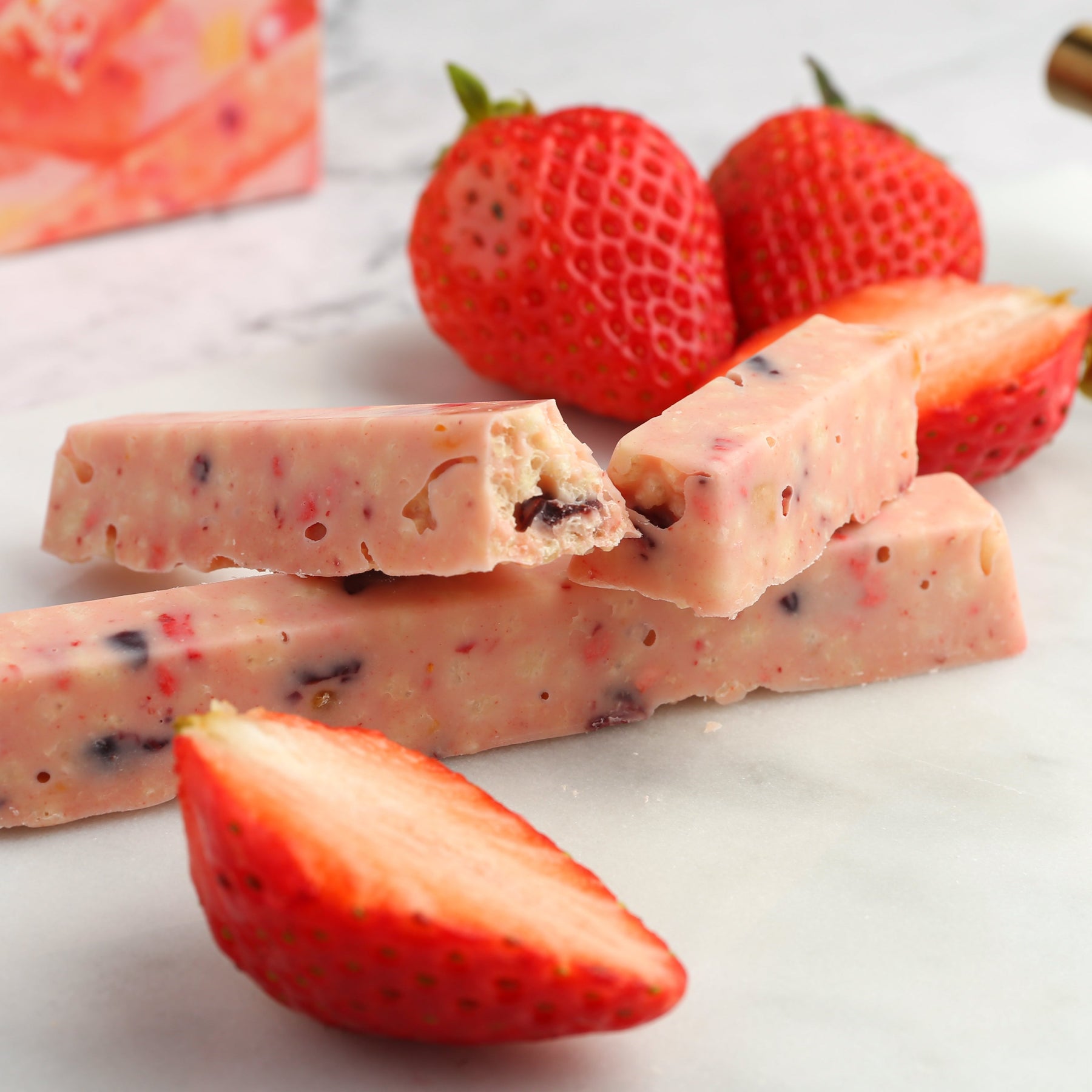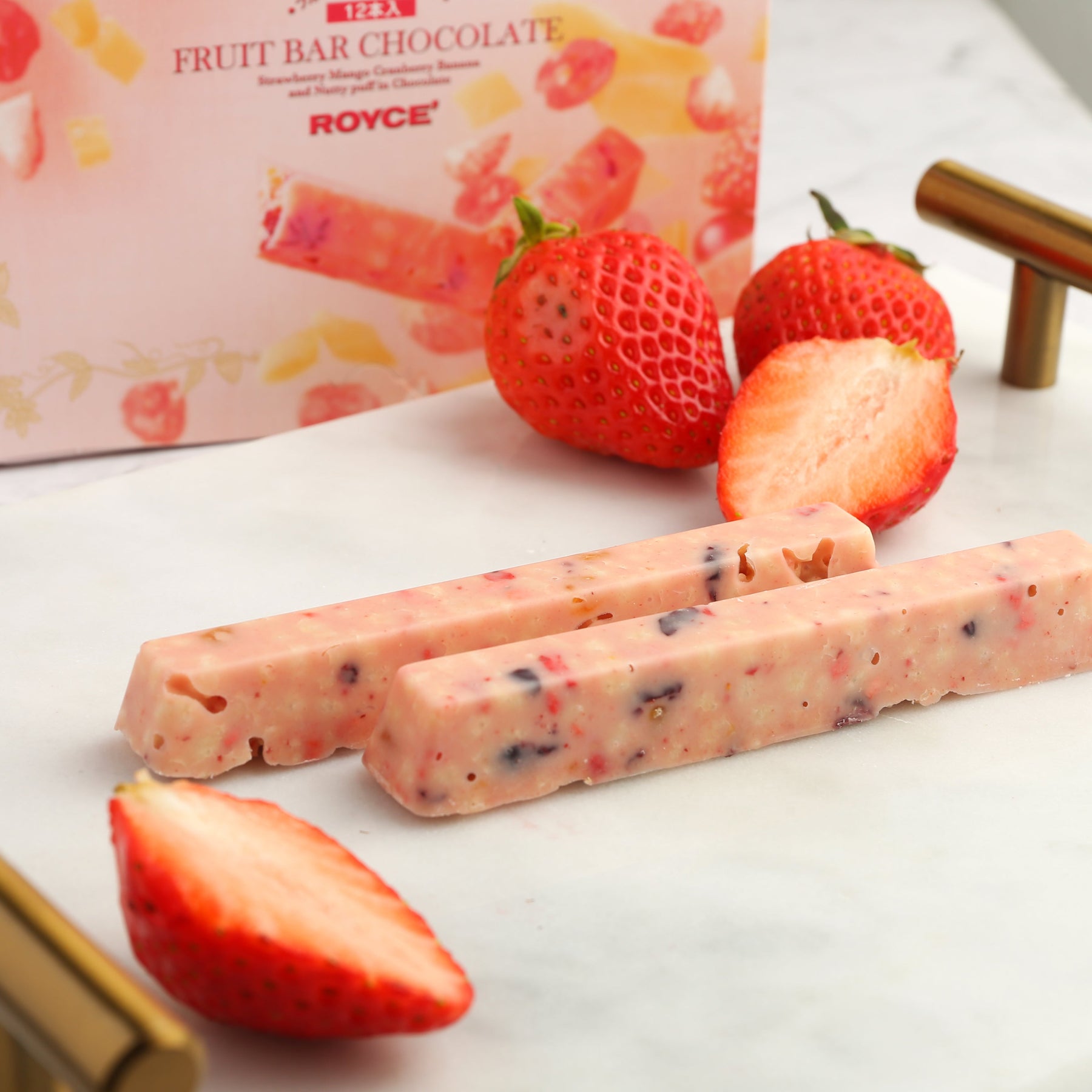 White chocolate mixed with powdered strawberries, three fruits, almond puff and given a touch of banana flavor.