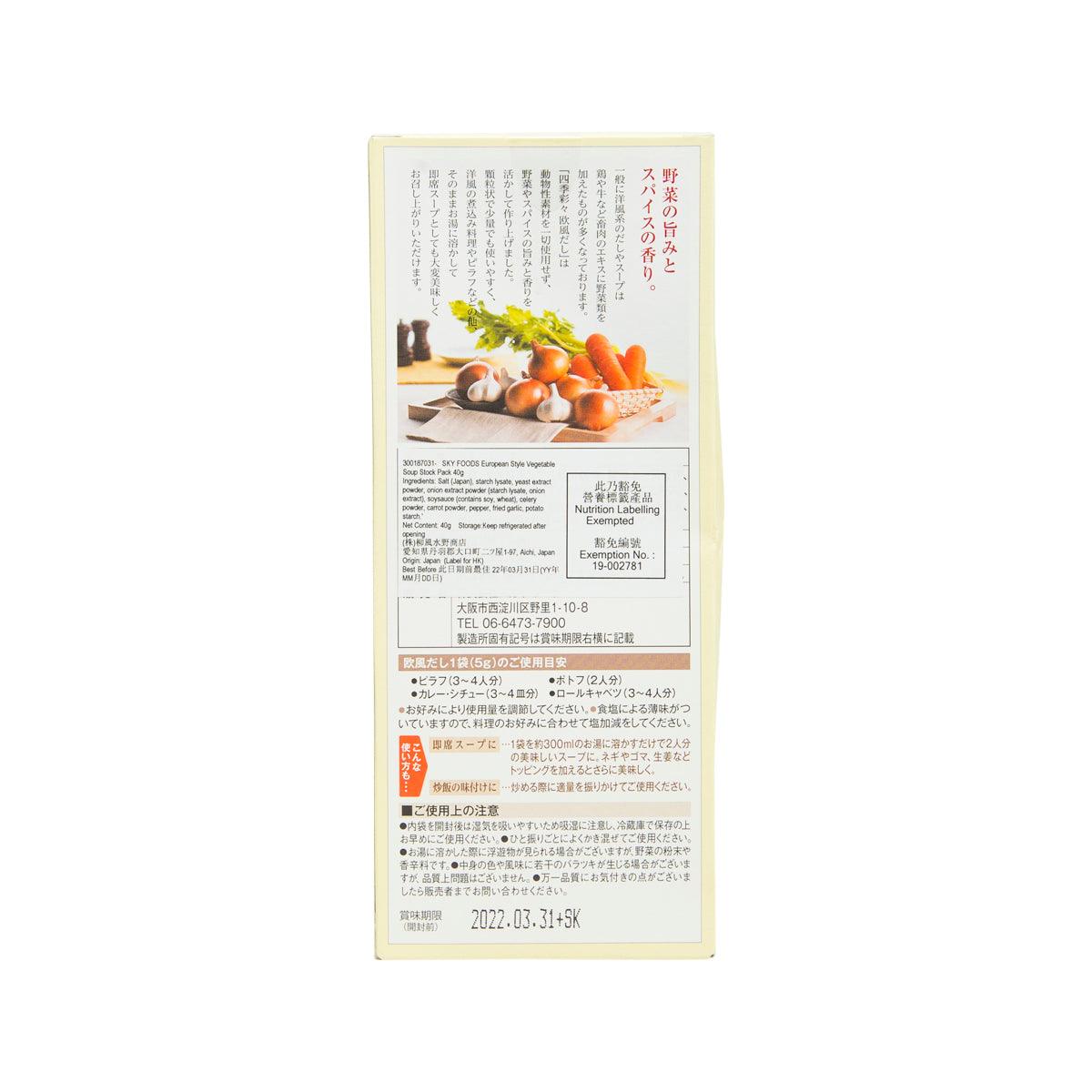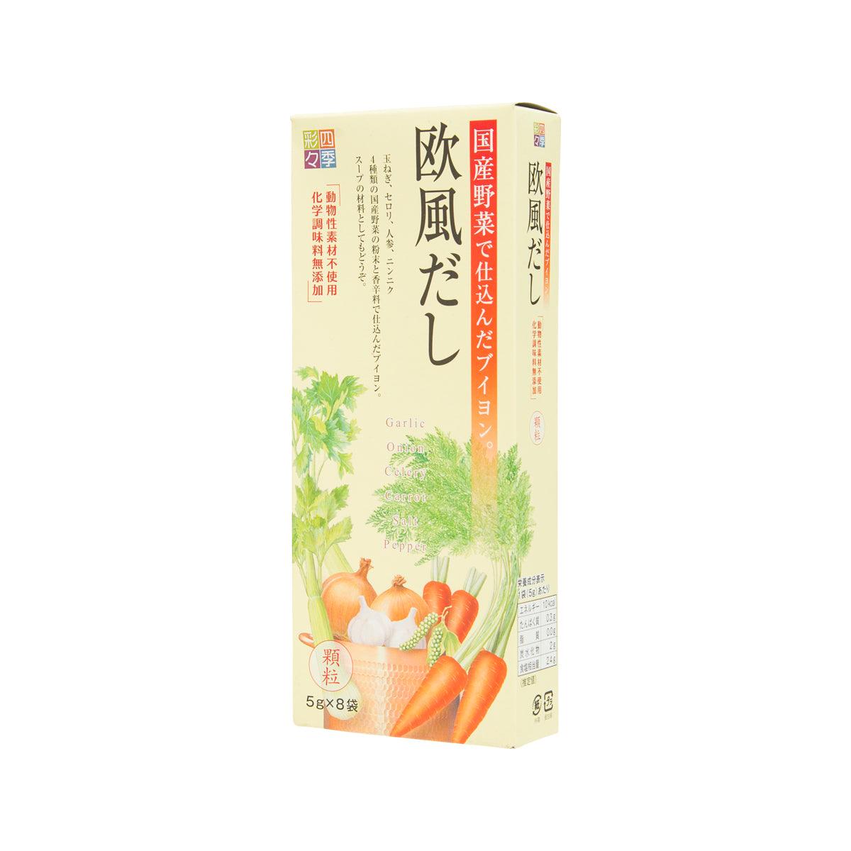 This granulated soup stock is made from Japanese vegetables and spices without any animal ingredients. It brings out the natural flavor and aroma of the vegetables. Individually sealed packaging preserves freshness and makes it easy to use for a variety of Western dishes or instant soups.