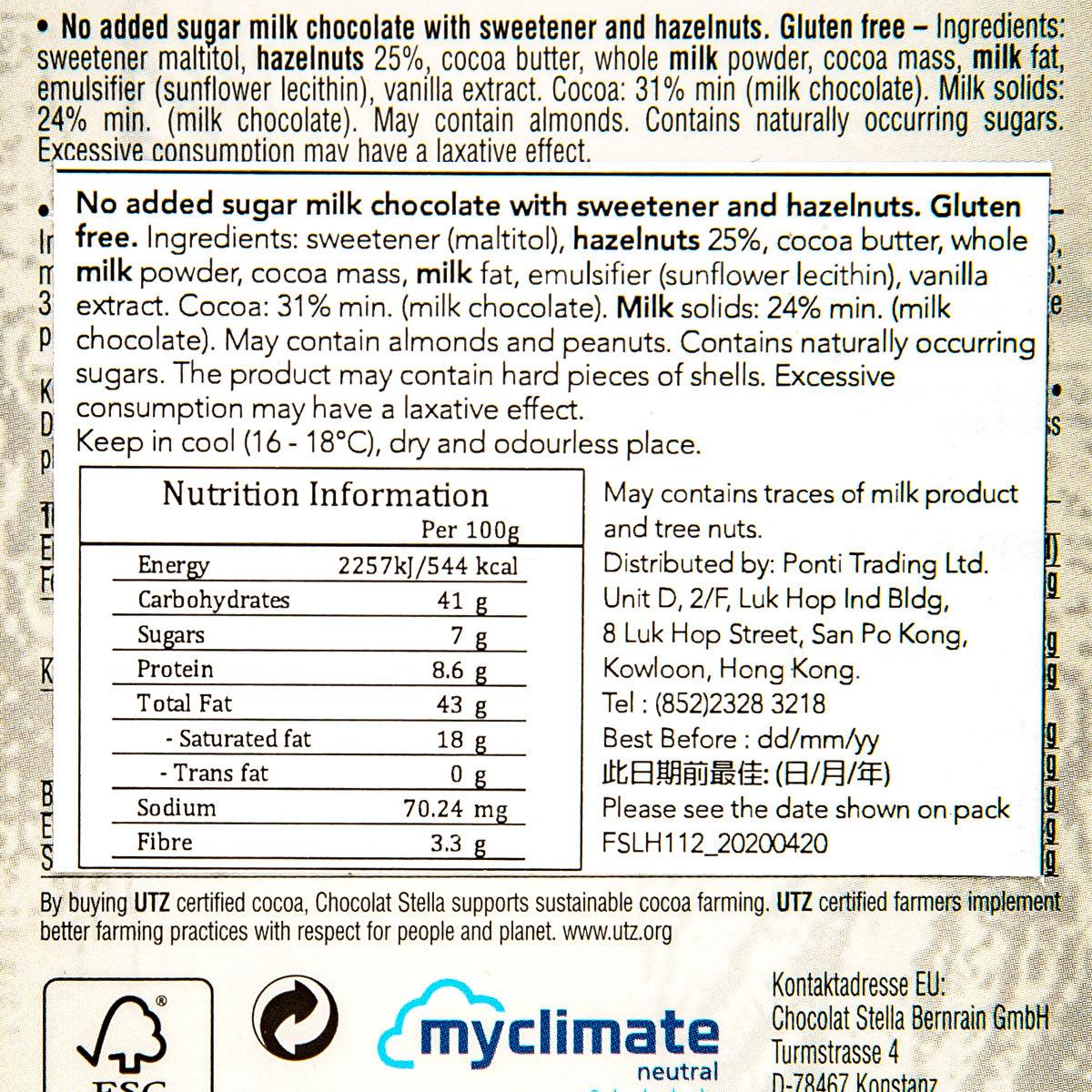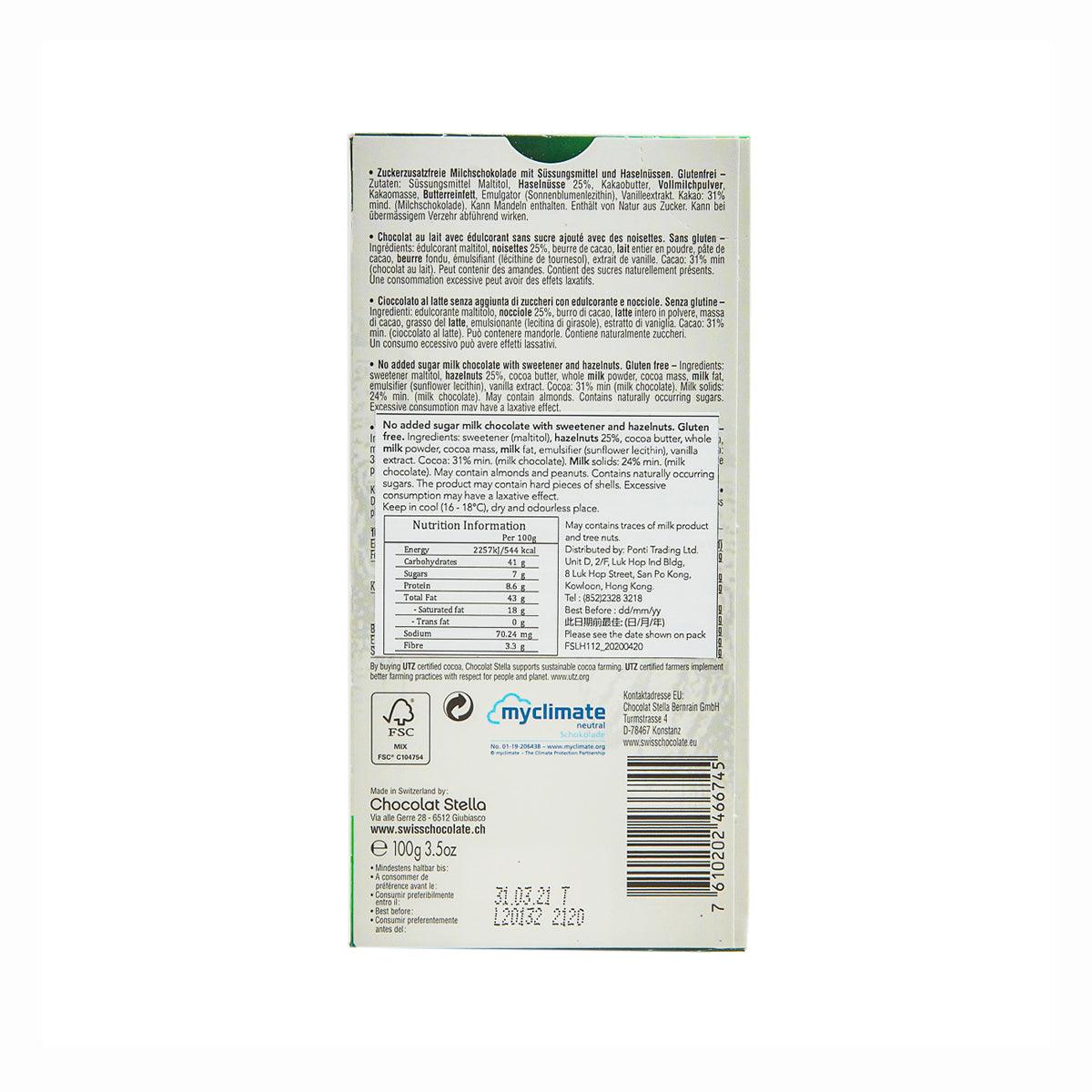 As an imaginative Swiss chocolate producer that also excels in realising its concepts, the Swiss family-owned company draws on a wealth of creative ideas to produce high-quality chocolate specialities that fully meet the wishes of its customers. This milk chocolate is smooth and delicious, with the crunchy hazelnuts added creating the irresistible taste, but no added sugar! Perfect news for those chocolate enthusiasts who concern about their health!