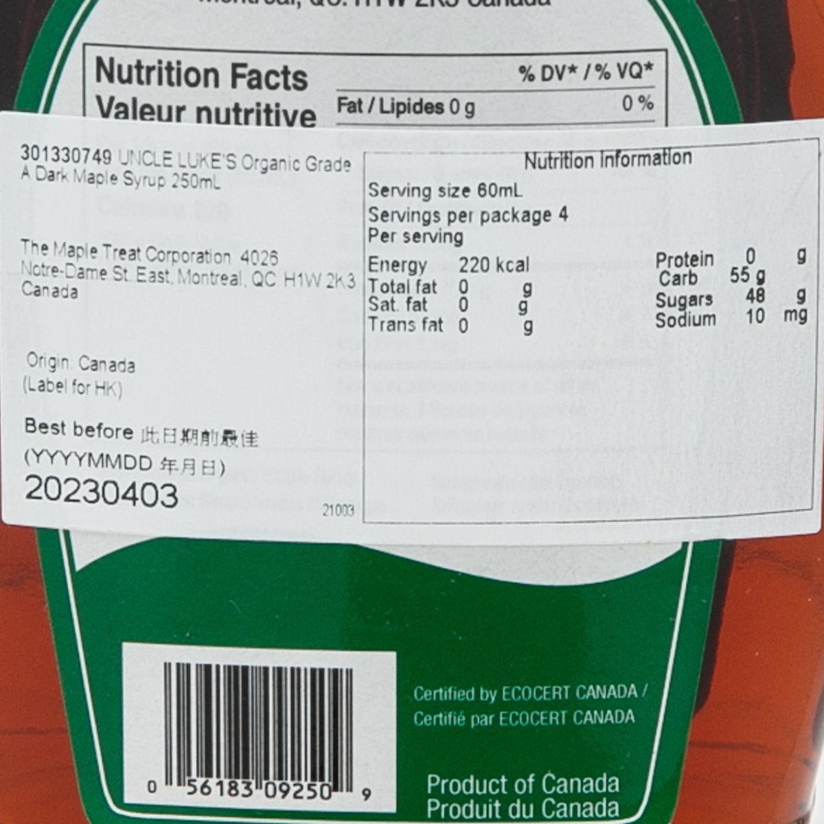 UNCLE LUKE'S Organic Grade A Dark Maple Syrup (250mL)