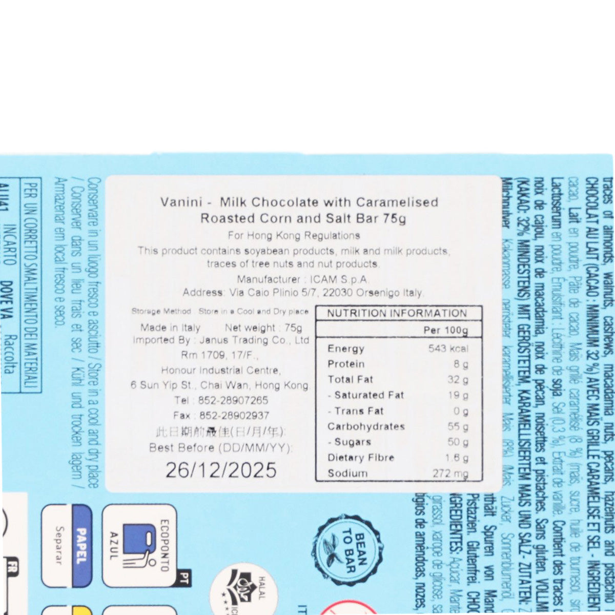 VANINI Milk Chocolate with Caramelised Roasted Corn & Salt Bar (75g)